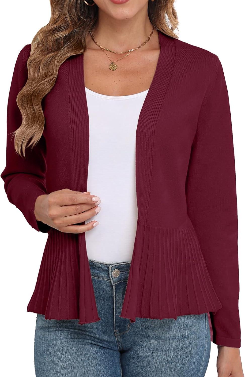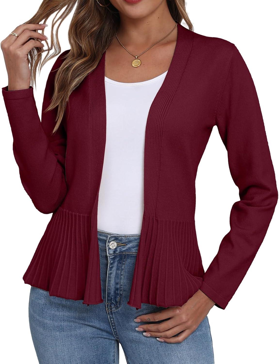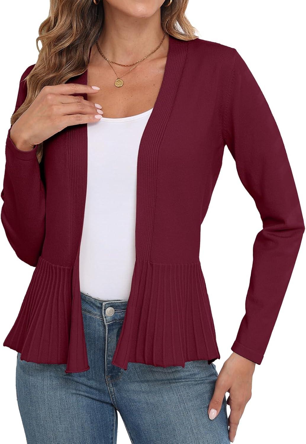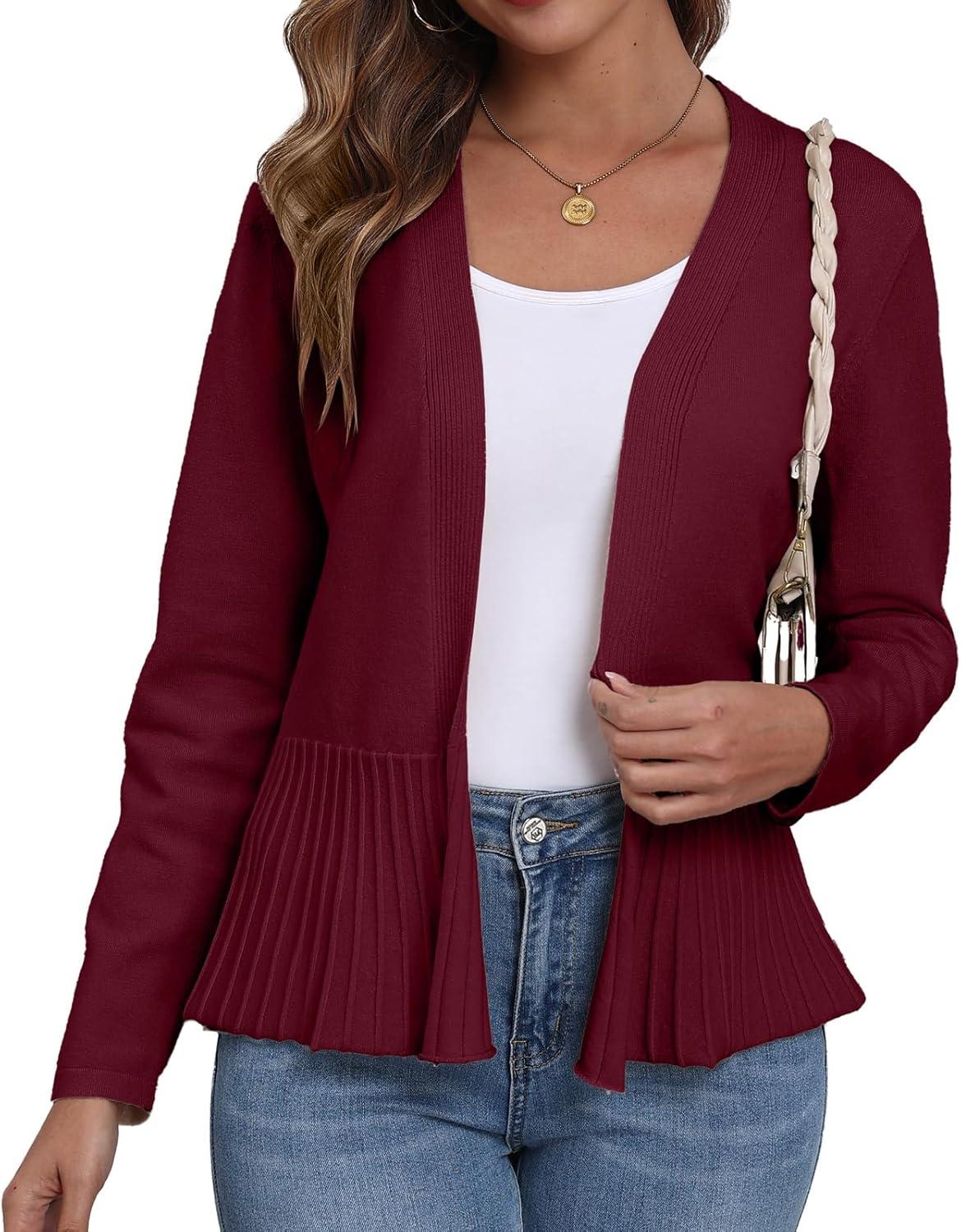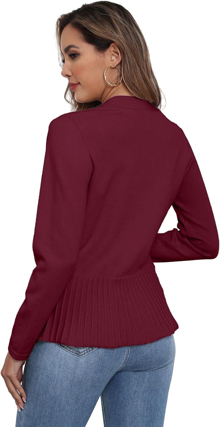 GRECERELLE Women Lightweight Casual Long Sleeves Cropped Cardigan Open Front Peplum Knit Sweater Outwear(Wine Red)